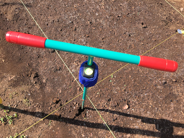 穴掘り器の軸に水準器を取り付けして、真っすぐ(鉛直)の園芸支柱の穴をあけます。
