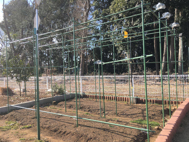 ミニカボチャとカボチャの空中栽培をするための棚作りを行います。