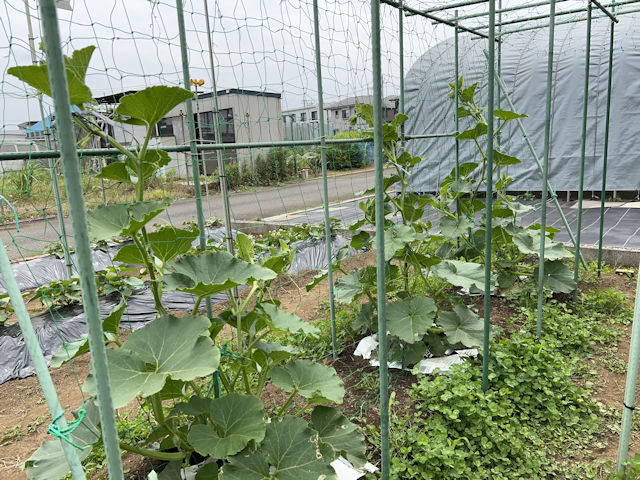 右側畝のカボチャの様子です。こちらもツルが上部まで伸びています。