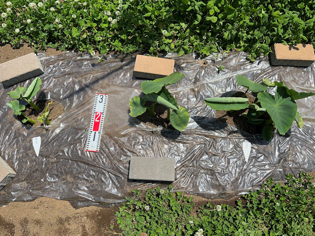 サトイモの親芋を種芋として植付したら、大変な事になっています。