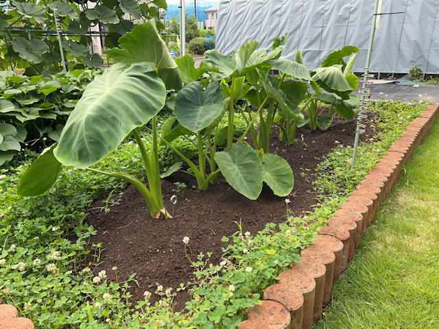 かなり葉っぱが大きくなっています。回りの緑の部分は緑肥にするクローバーです。